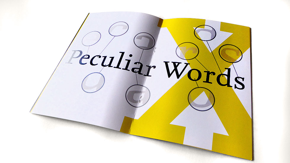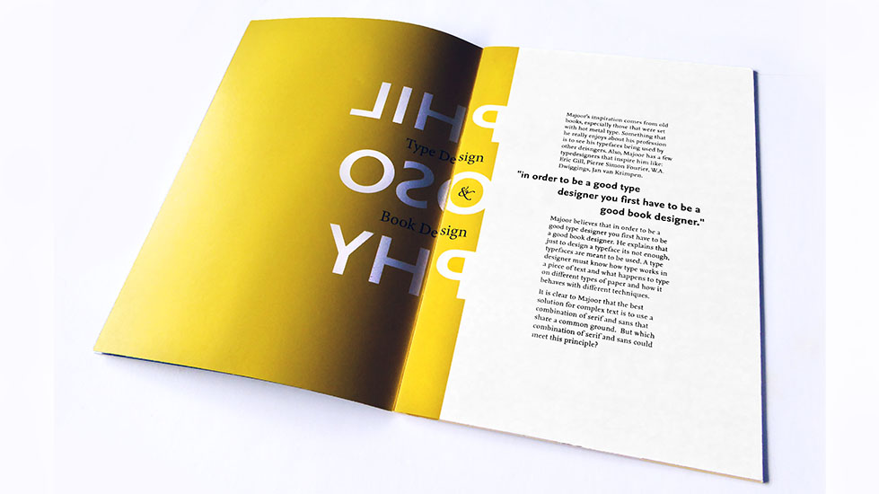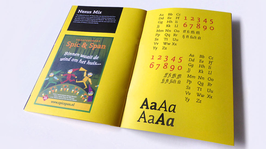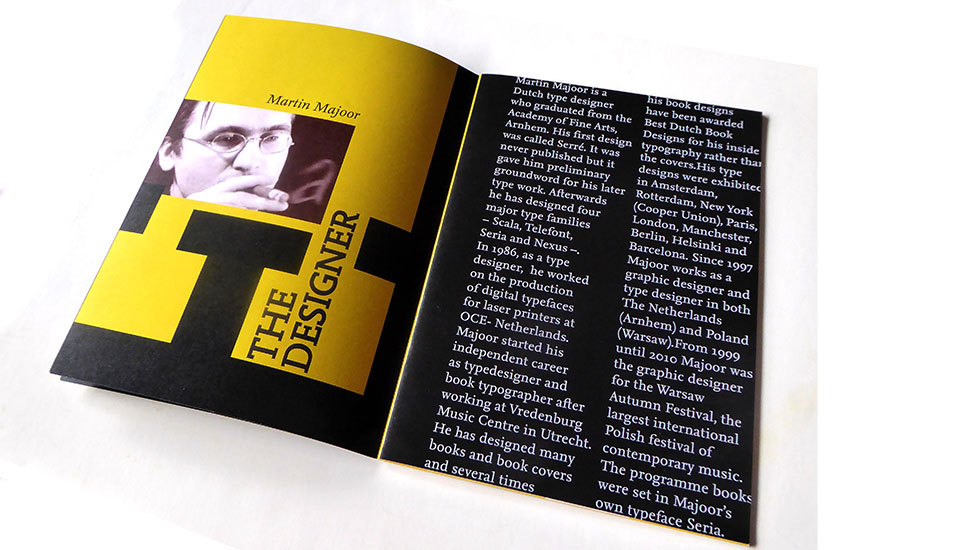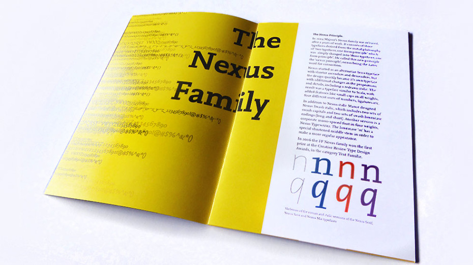 Nexus font booklet that features examples, font specimen, description and biography of the designer Martin Majoor.